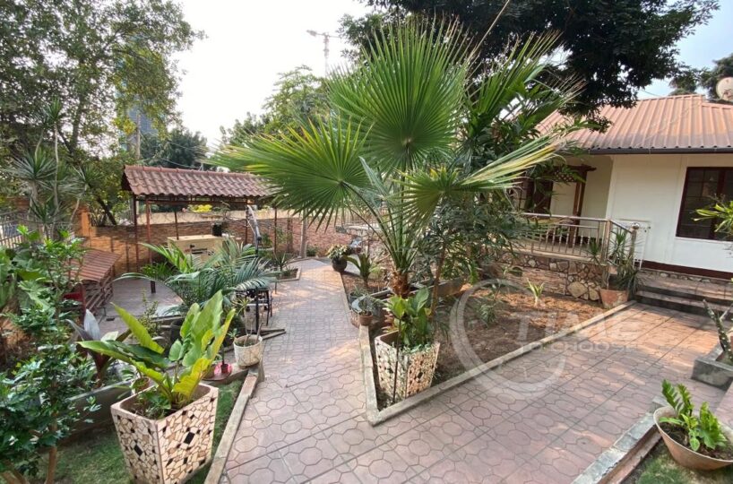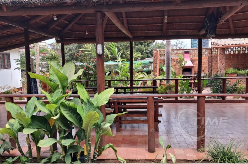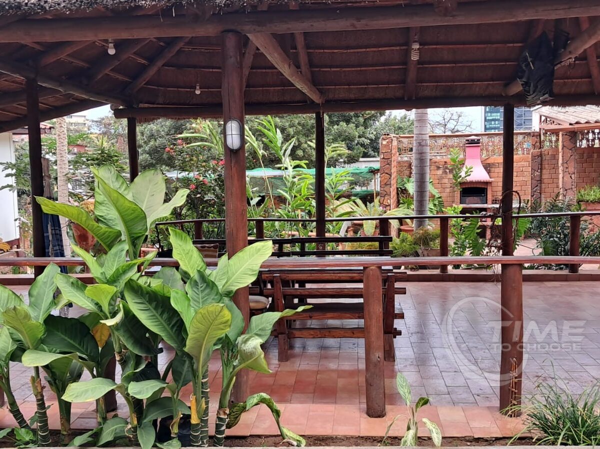 O espaço é rodeado por muitas plantas verdes e floridas, criando um ambiente tranquilo e sereno em meio ao bulício da cidade. O jango é um ponto de encontro perfeito para relaxar e desfrutar do ar fresco.